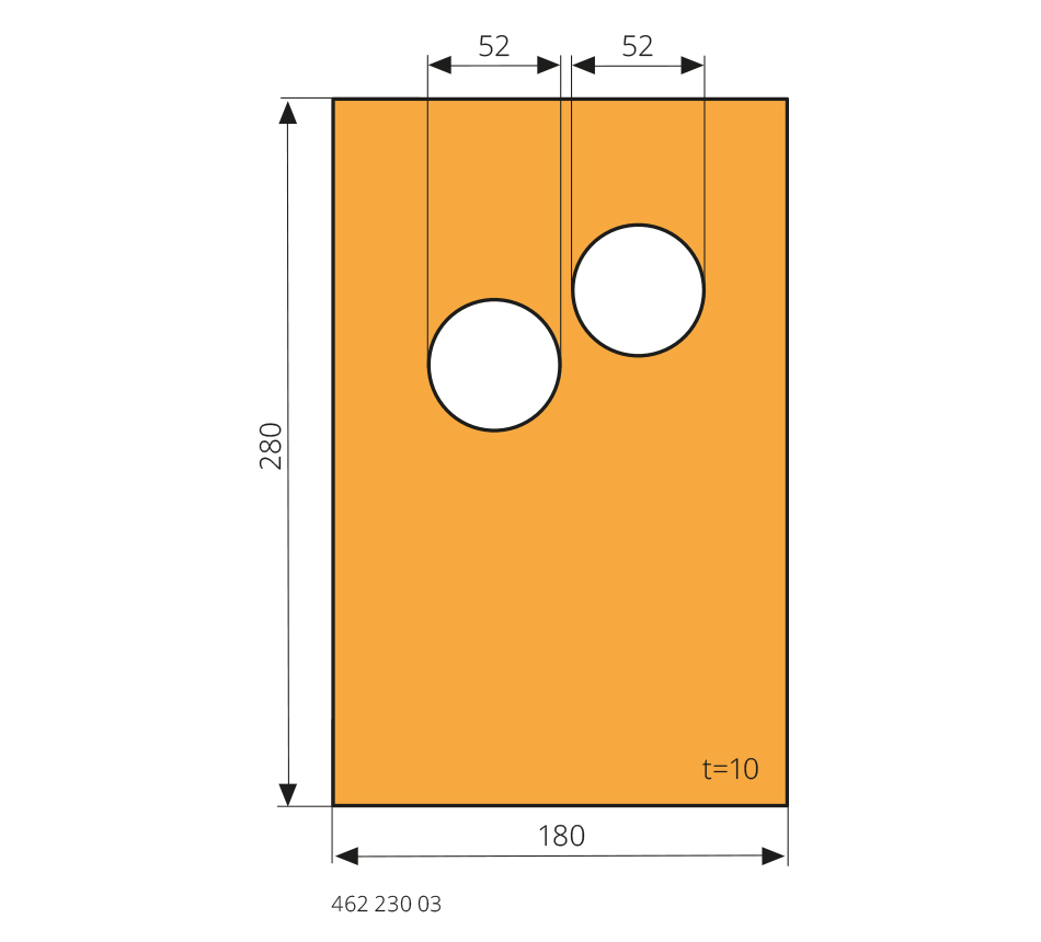 Dimensions: 10x180x280mm, 2x fi52mm Design: internal, without pin lock set: 2 pieces Notes: S355J2