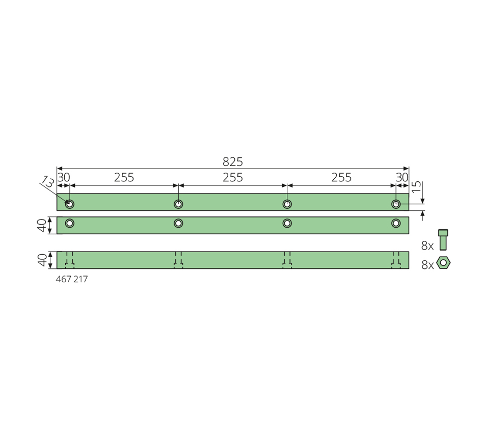 Dimensions: 40x40x825mm Type: 2-piece, with screws and nuts Notes: 42CrMo4