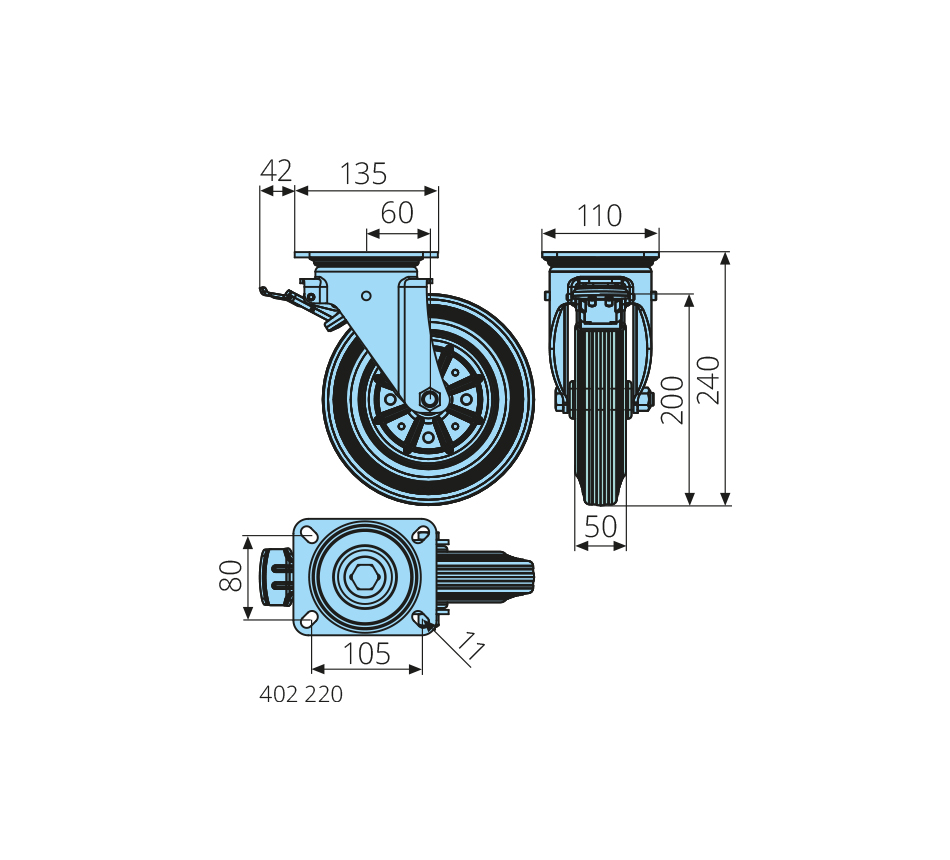 A-200mm, B-50mm, C-240mm, D-135x110mm, E-105×80/75mm, F-11mm, G-60mm, H-110mm,Obciążenie -250kg, z hamulcem