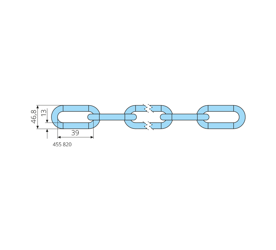 Wymiary: B-46,8mm, t-39mm Wykonanie: zabezpieczenie antykorozyjnie, GK8, łańcuch – NG13mm Kolor: srebrny Obciążenie robocze: 5300kg Uwagi: EN 818-2, dopuszczony DIN 5867-