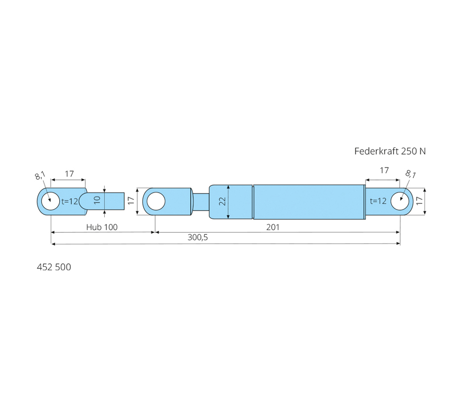 Siła: 250N Skok: 100mm Długość: 201/300,5mm, Cylinder: D – 22mm Tłoczysko: D – 10mm Oczko przykręcane: 12x17mm