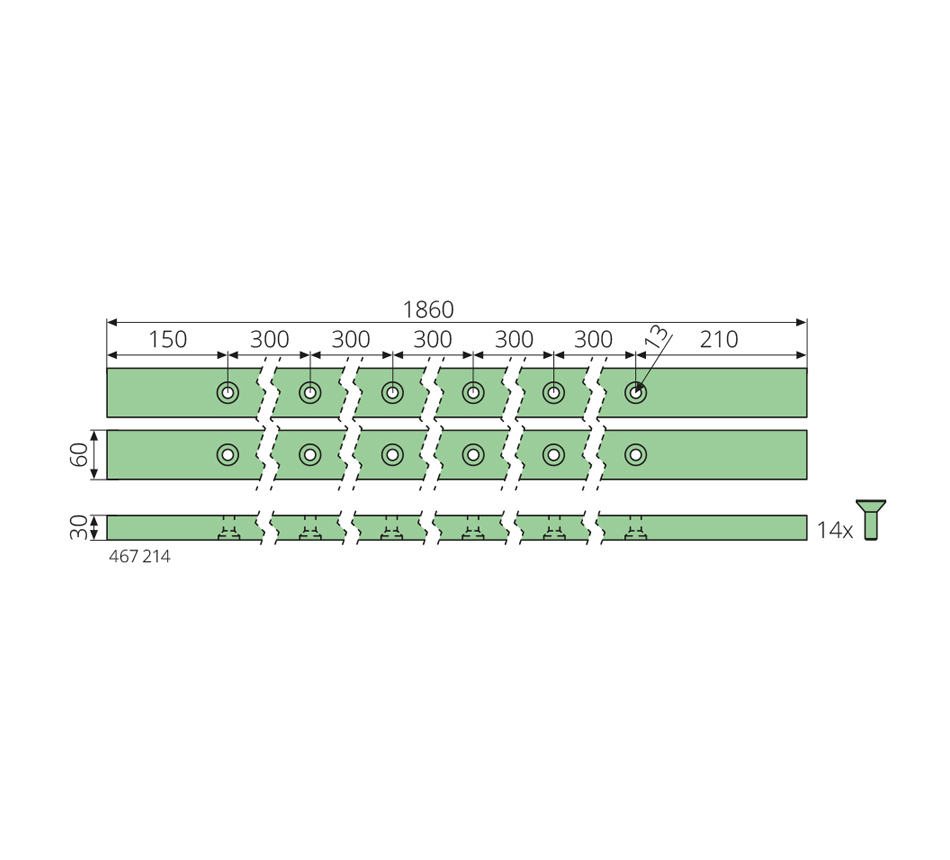Wymiary: 60x30x1860mm Wykonanie: 2-częściowy, z wkrętami i nakrętkami Uwagi: 42CrMo4