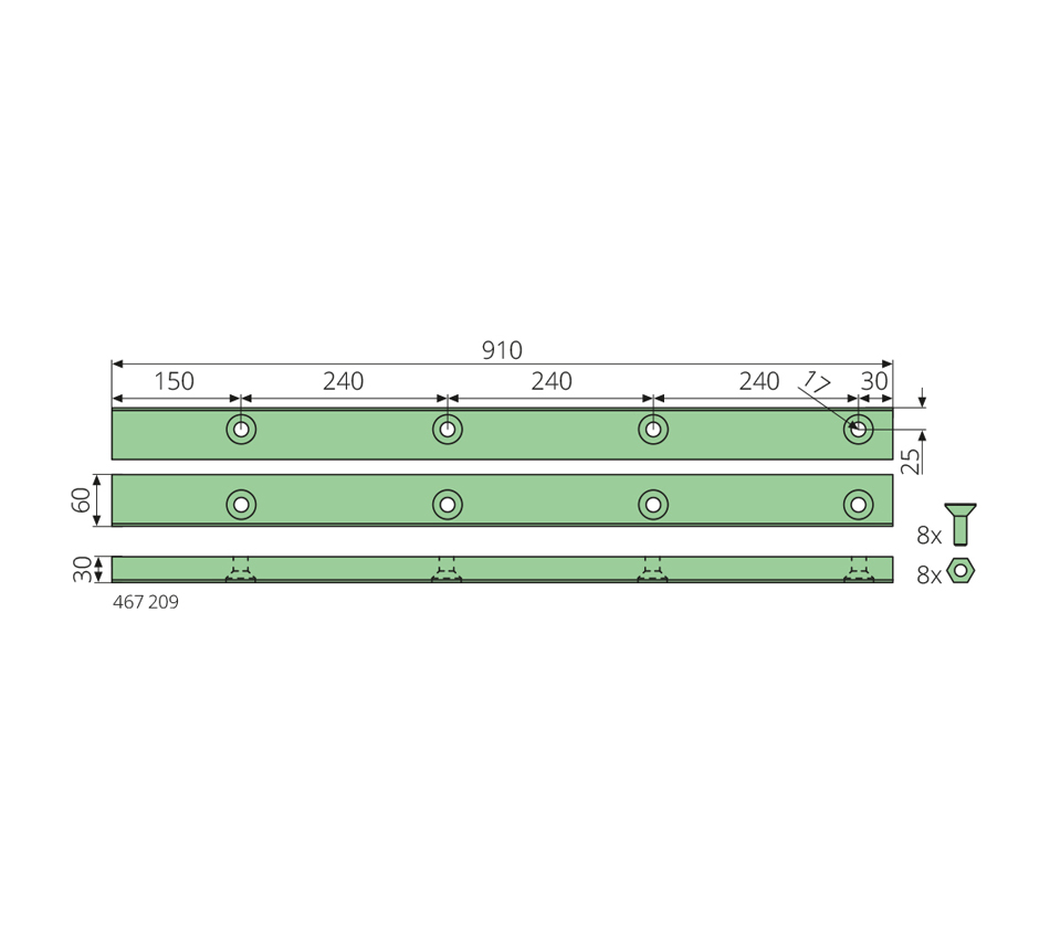 Wymiary: 60x30x910mm Wykonanie: 2-częściowy (lewa + prawa), ze śrubami i nakrętkami Uwagi: 42CrMo4