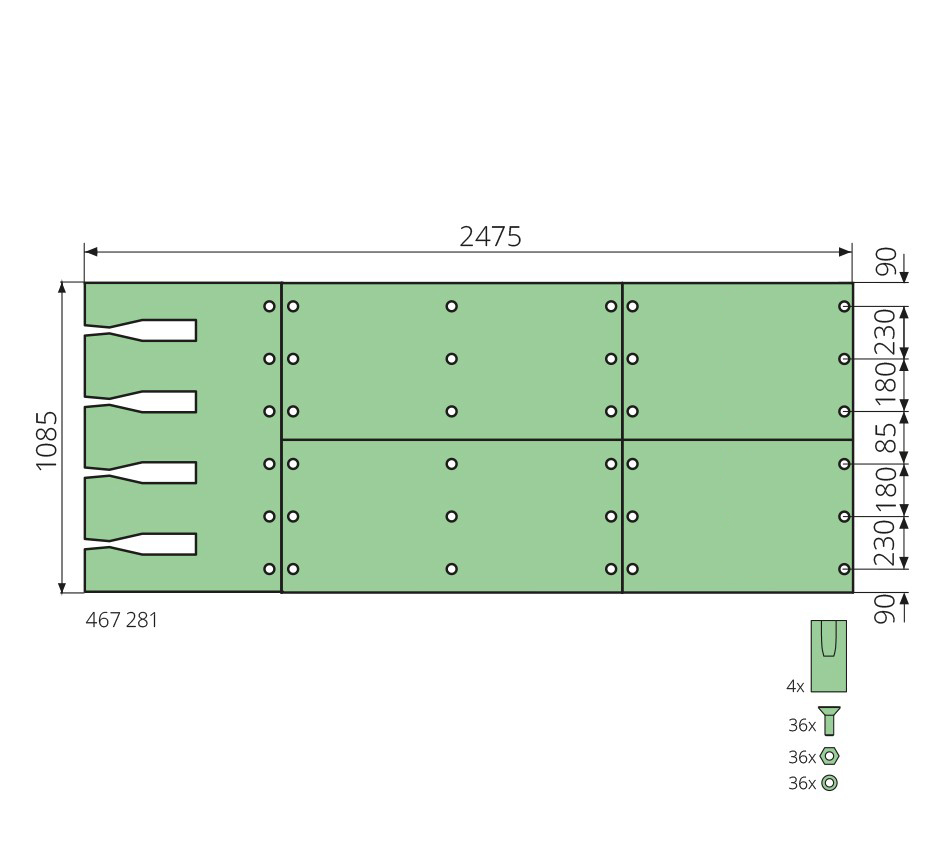 Wymiary: 2475x1085mm, 90mm Wykonanie: z zestawem śrub – 36 szt. i płyt rowkowanych – 4 szt.